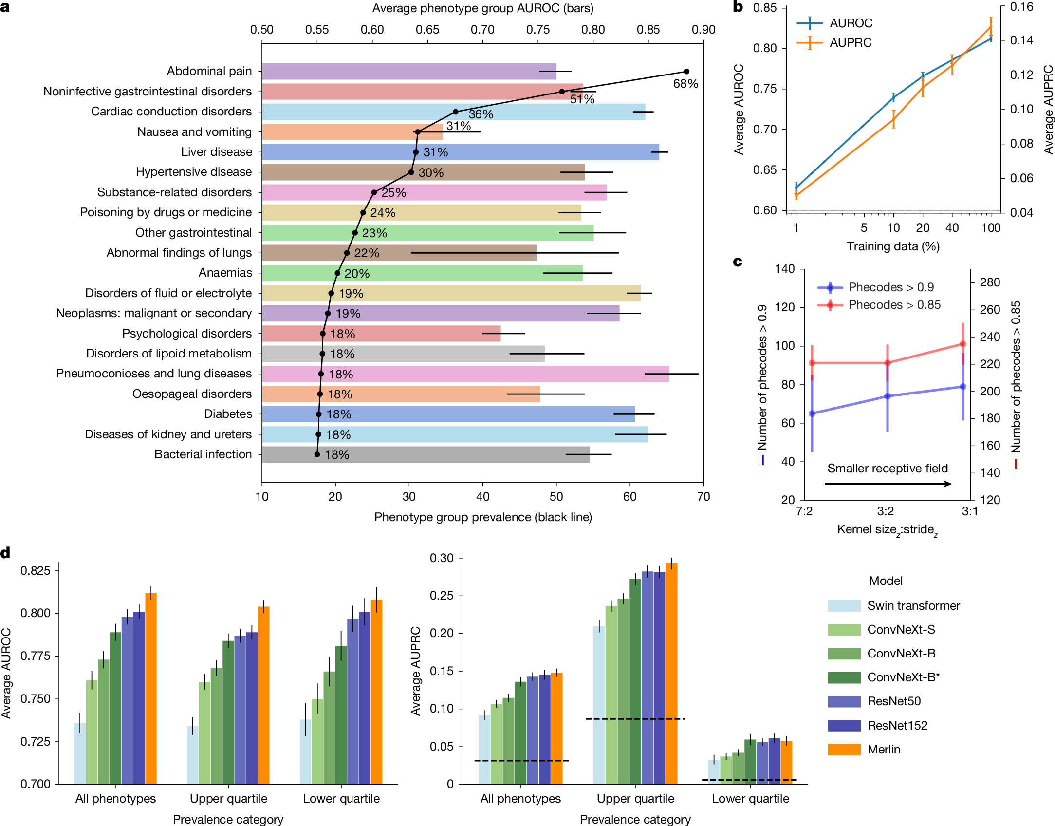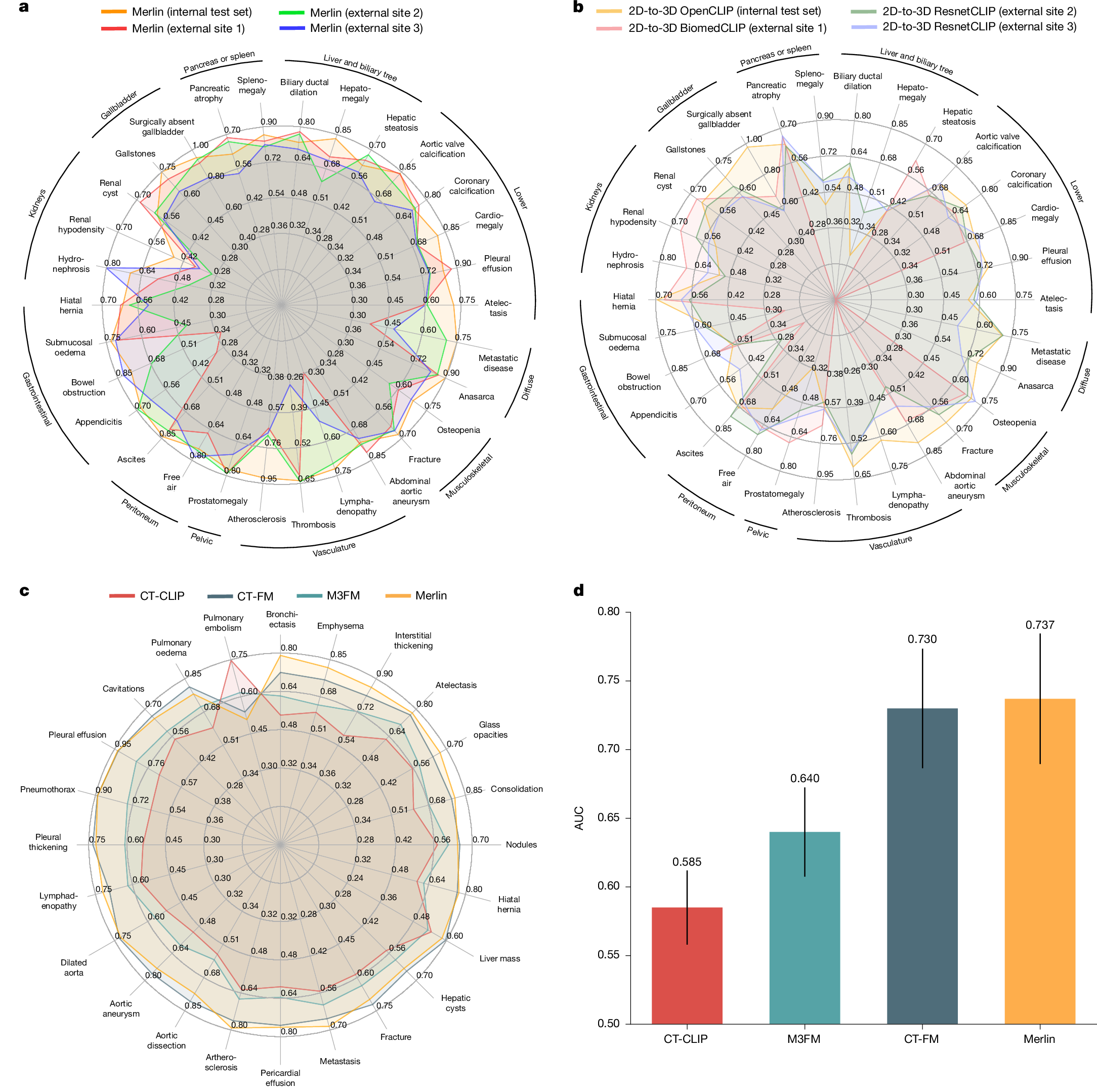 We have released the Merlin abdominal CT dataset to the community (https://stanfordaimi.azurewebsites.net/datasets/60b9c7ff-877b-48ce-96c3-0194c8205c40). This large-scale abdominal CT dataset contains 25,494 scans of 18,317 unique patients, with each scan paired with its corresponding radiology report. Exams include abdominal and pelvis CT scans, identified using CPT codes 72192, 72193, 72194, 74150, 74160, 74170, 74176, 74177 and 74178, selected via the STARR tool (Stanford Medicine Research Data Repository). For each exam, the DICOM series with the largest slice count was retained and converted to NIfTI format for ease of use. Scans were compressed and de-identified by removing all patient-identifiable metadata. The Merlin abdominal CT dataset is hosted by the Stanford AIMI Center. Access requires completion of a data-use agreement form on the download page of the dataset. Following approval, a secure Azure Blob Storage URL is provided for download from the Merlin abdominal CT dataset download page. Additional download instructions are available in the documentation (download documentation). The following external publicly available datasets were used: the VerSe dataset is available via the Open Science Framework (https://osf.io/nqjyw/) and the TotalSegmentator dataset is publicly available at GitHub (https://github.com/wasserth/TotalSegmentator). Furthermore, the Merlin model was evaluated on abdominal CT images and associated radiology reports from three external clinical sites. These datasets are not publicly available owing to patient privacy considerations and data-use agreements but were accessed under appropriate institutional approvals and used solely for evaluation. All datasets were accessed and used in accordance with their respective data-use agreements and licences.