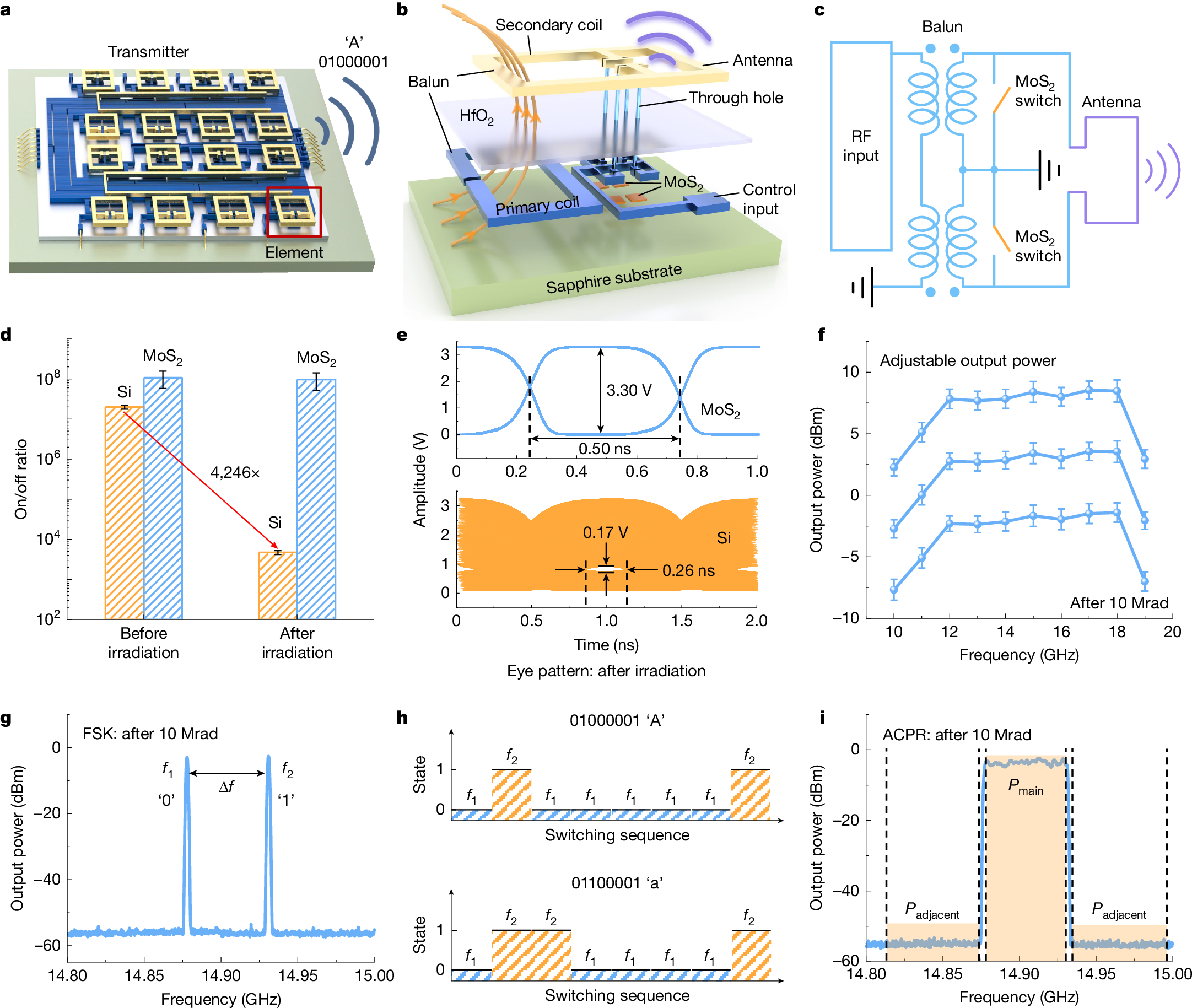 Researchers developed a radiation-tolerant RF communication system using atomic-layer 2D MoS2 transistors for space applications. After 9 months in low Earth orbit, it maintained a bit error rate below 10^-8, with a predicted lifespan of 271 years in harsher environments. This demonstrates the potential of 2D electronics for durable spaceborne technology.