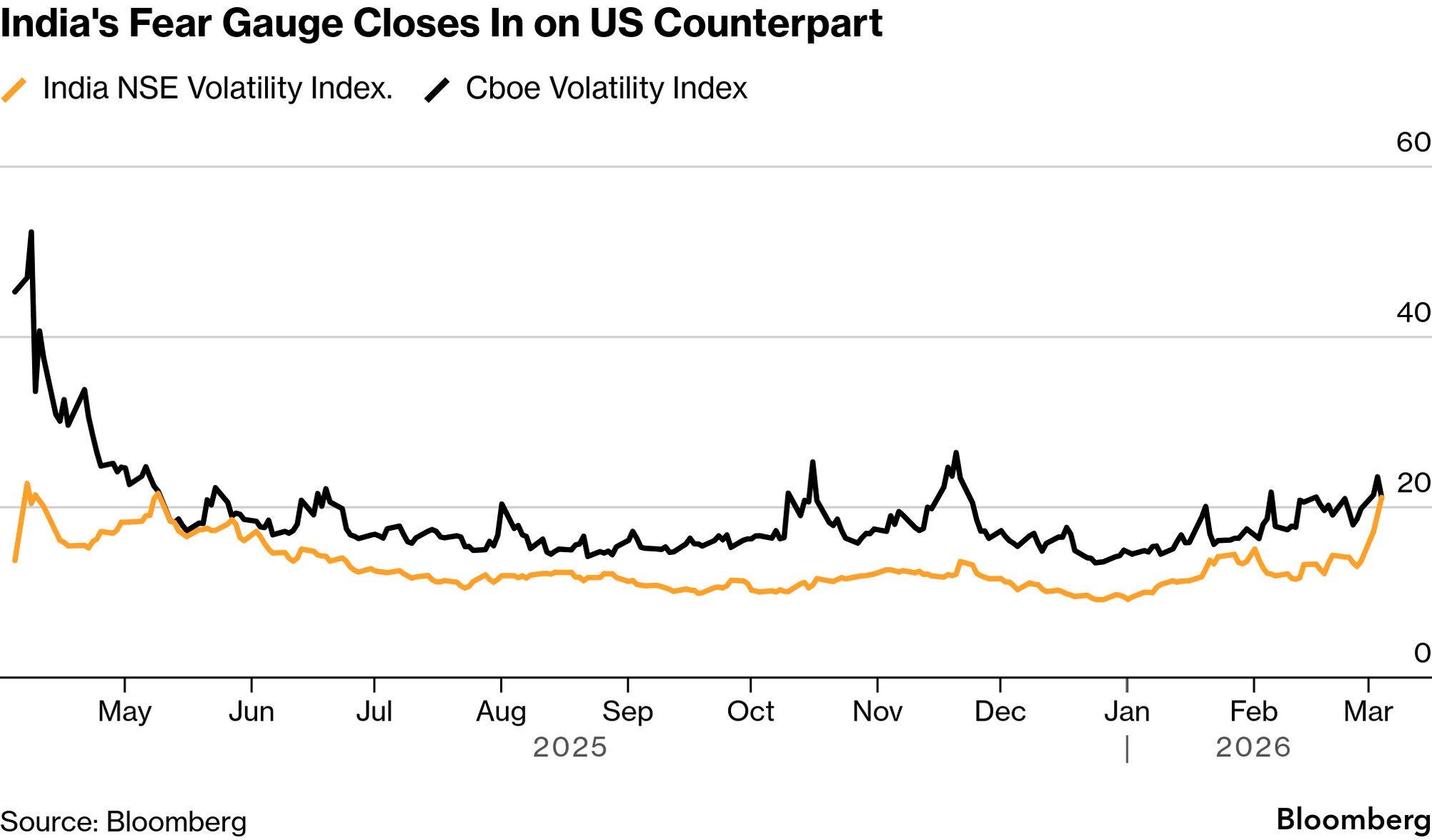 India’s gauge of implied volatility — also known as the market’s fear gauge — is closing in on the US counterpart. It briefly moved above the US VIX in May last year during a spell of domestic uncertainty in a rare crossover. Now, after a calm 2025, volatility is picking up again as traders buy protection against fresh uncertainty from the Middle East conflict. If India’s gauge rises above its US counterpart again, it could spur higher trading activity from proprietary and high-frequency desks that have struggled during the recent period of low volatility.