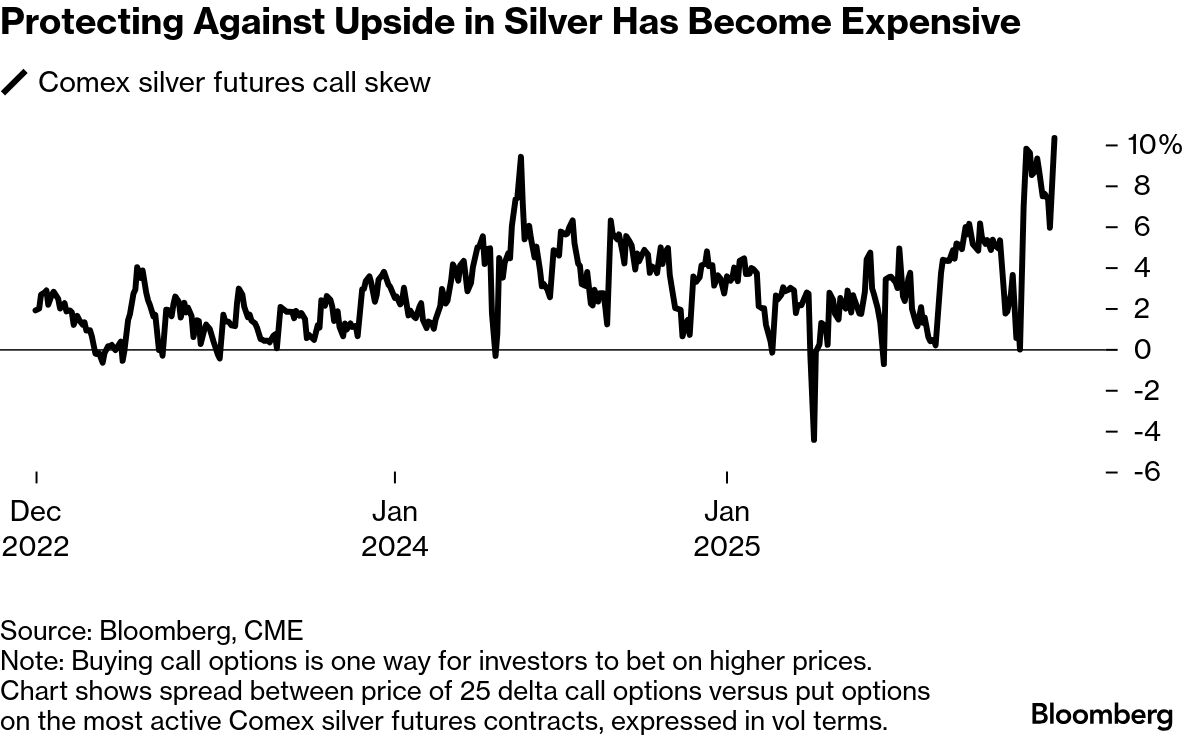 For iShares Silver Trust (SLV), the largest silver ETF, total call open interest hit the highest since 2021 this week. The cost of buying calls on silver futures relative to the cost of buying equivalent puts, which protect against price declines, has also jumped to historical highs in recent weeks.