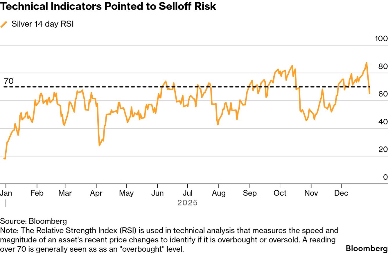 Silver prices jumped more than 25% in December alone, on track for the biggest monthly increase since 2020. The speed of the gains means that some technical indicators are signaling that prices have run too far, too fast. The metal’s relative strength index — a gauge of buying and selling momentum — has stayed above 70 for most of the past few weeks. A reading higher than 70 usually indicates that too many investors bought it in a short period.