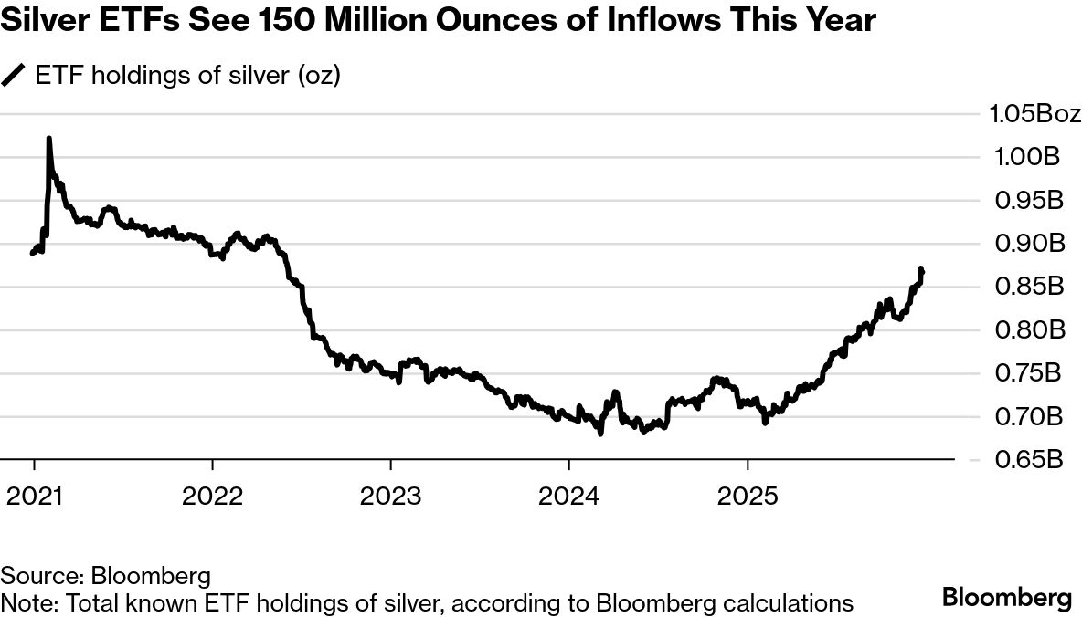 - •Inflows into physical-backed silver ETFs have surged by over 150 million ounces this year, tightening supply in an already constrained market.