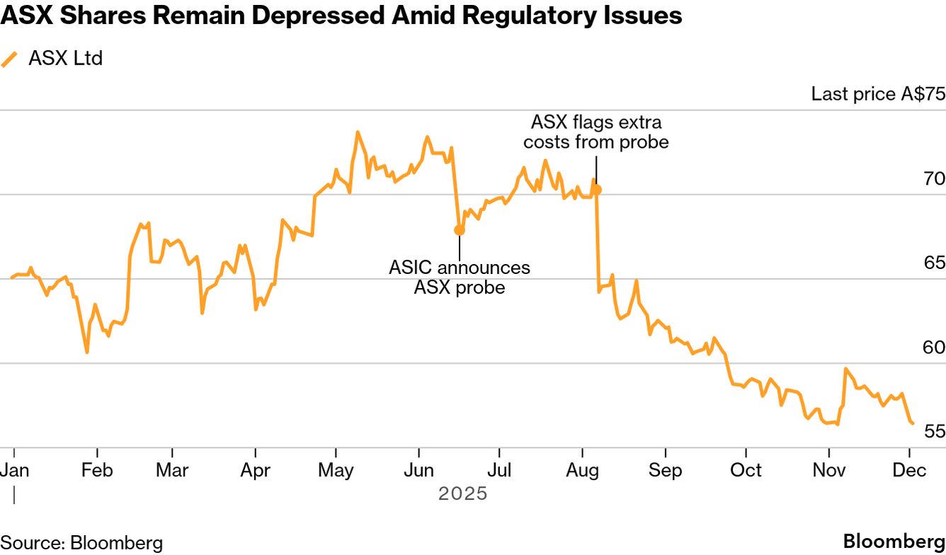 ASX’s stock is down about 14% this year after a string of technical issues, with the bourse’s governance and aging infrastructure coming under regulatory scrutiny. The firm expects a hit of as much as A$35 million ($22.9 million) in the next fiscal year from costs tied to the probe.