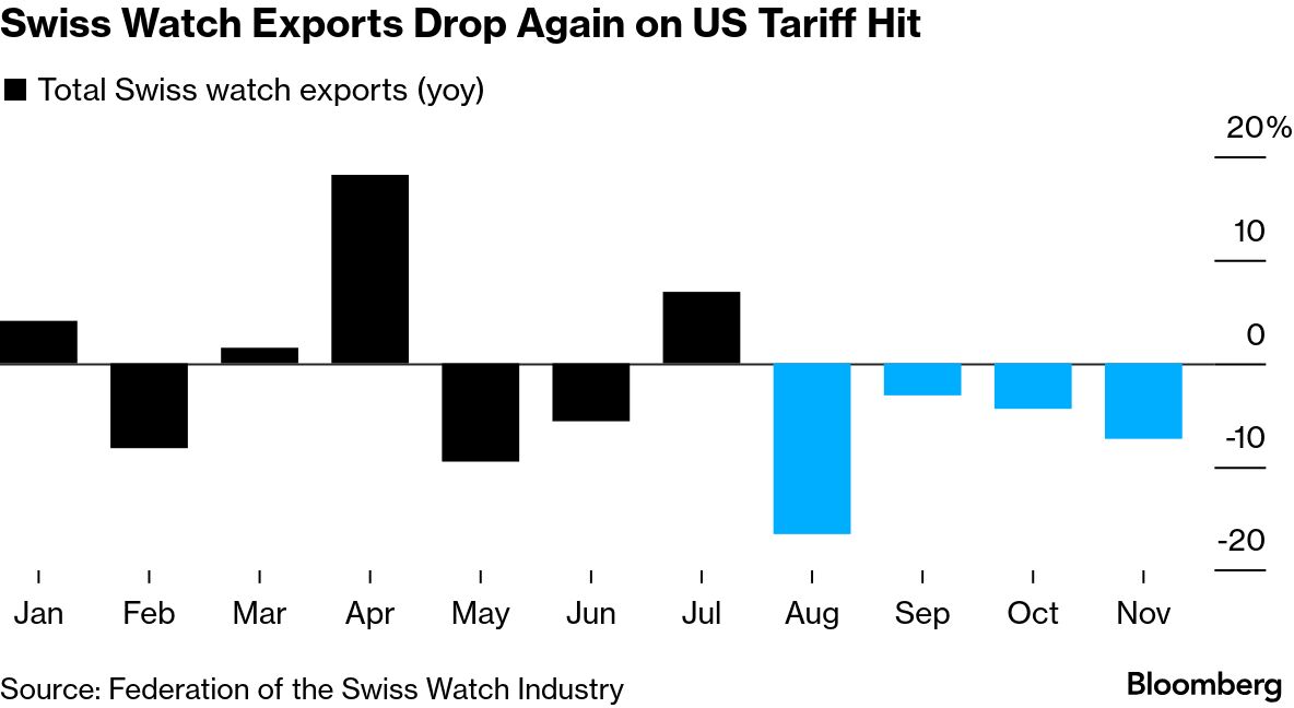 Swiss watch exports fell 7.3% in November, the fourth consecutive monthly decline, as companies awaited a US tariff reduction from 39% to 15%. Exports to the US dropped 52%, but a deal backdated to mid-November may boost future sales.