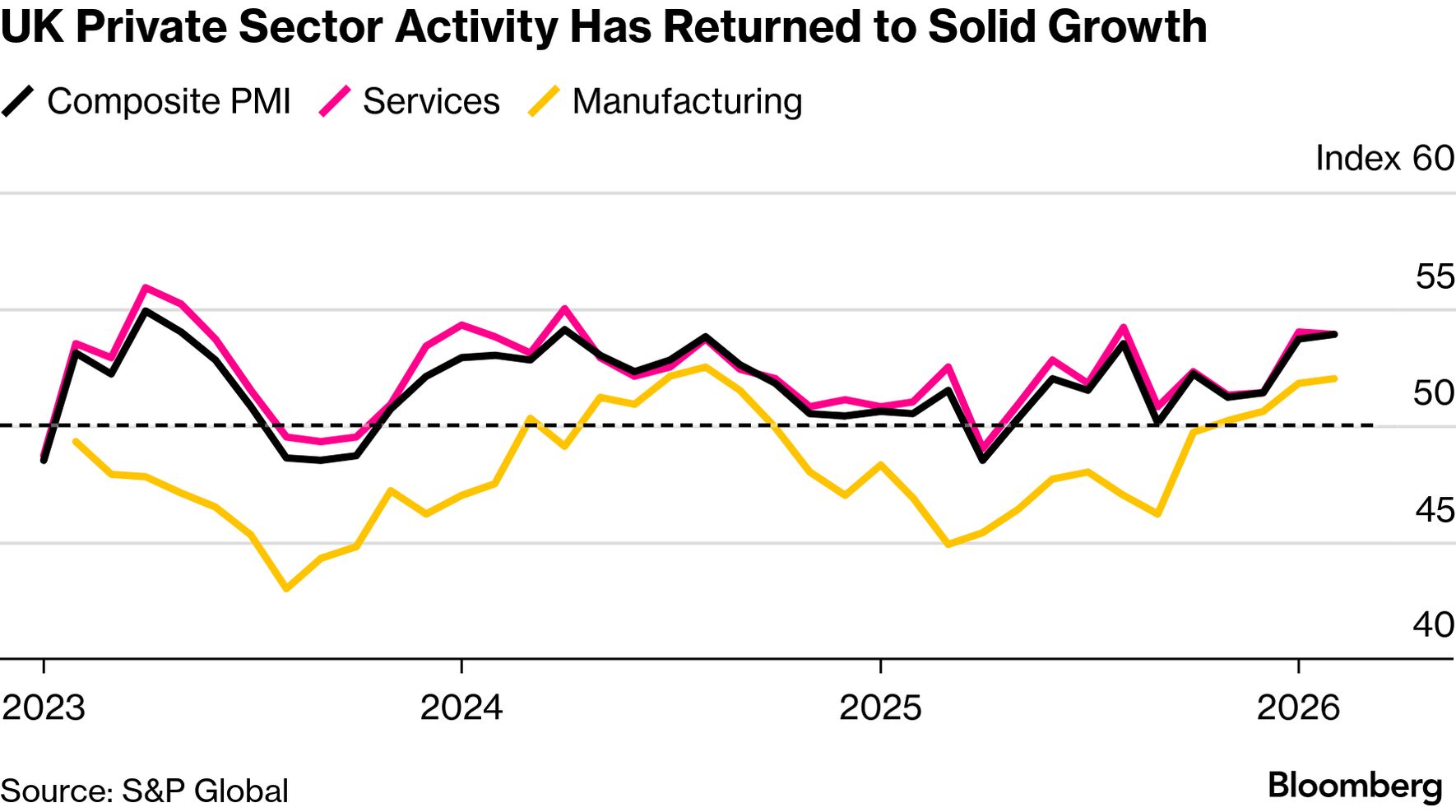 The double-dose of good news was swiftly followed by evidence of the economy maintaining its momentum to the current day. S&P Global’s purchasing managers’ index rose to 53.9 in February’s flash estimate, beating forecasts to hit the highest level since April 2024.