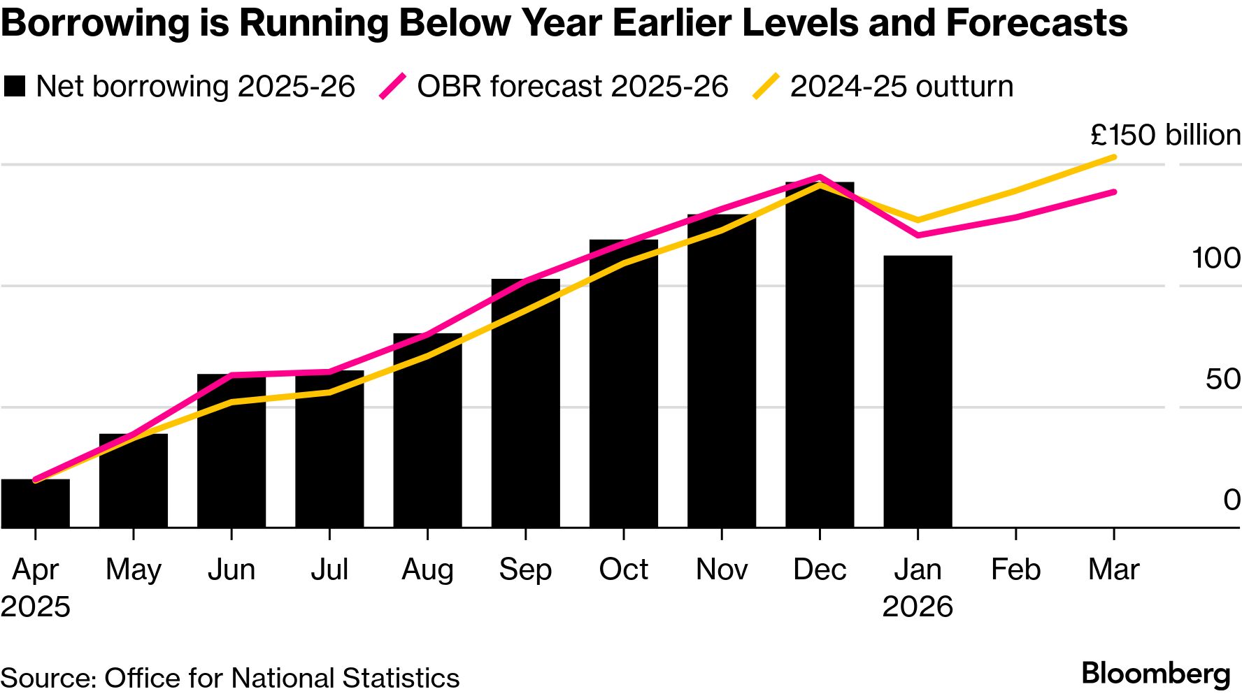 The numbers helped gilt yields lower. The 10-year bond is trading around 4.349%, roughly 26 basis points down on a year ago, helping to reduce debt-interest payments.