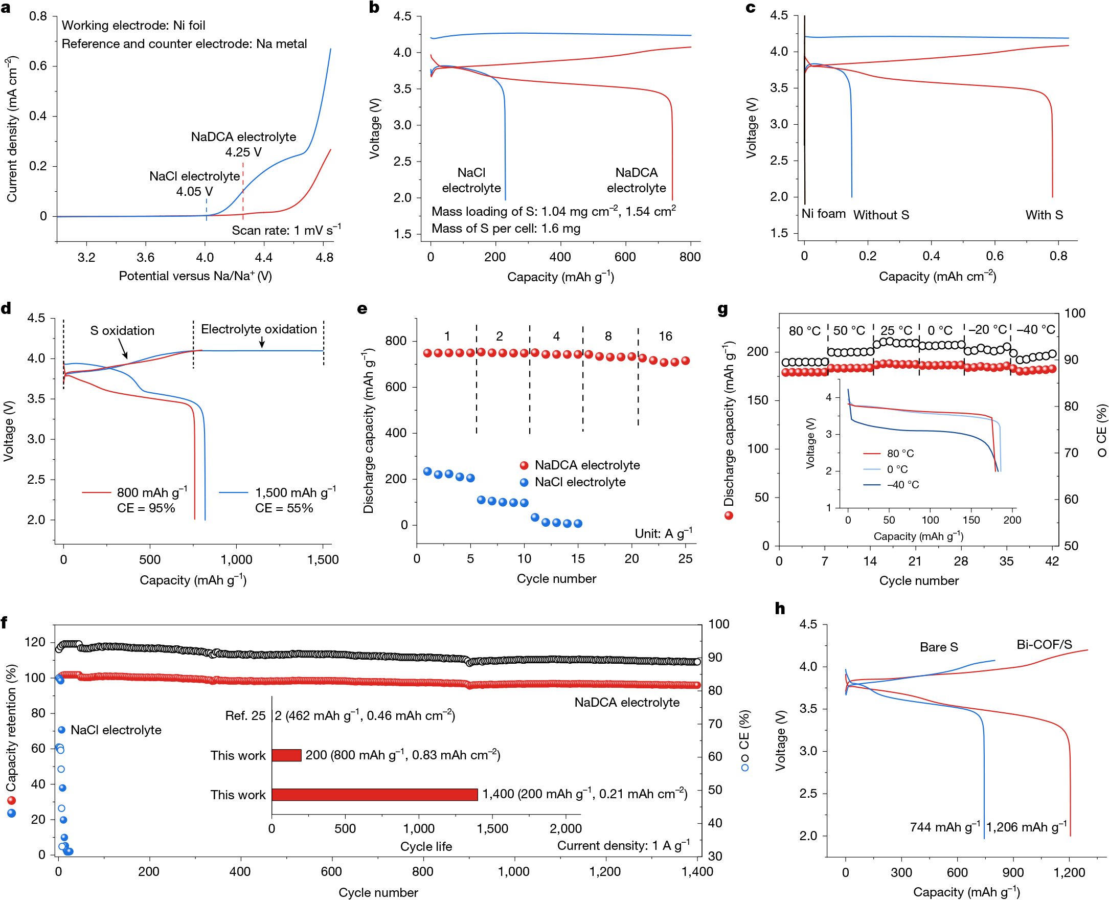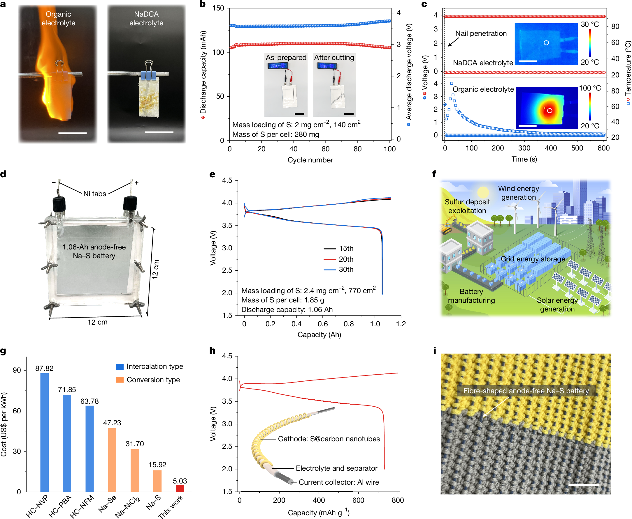 - •A 3.6 V class anode-free Na-S battery was created using S/SCl4 cathode chemistry and NaDCA electrolyte