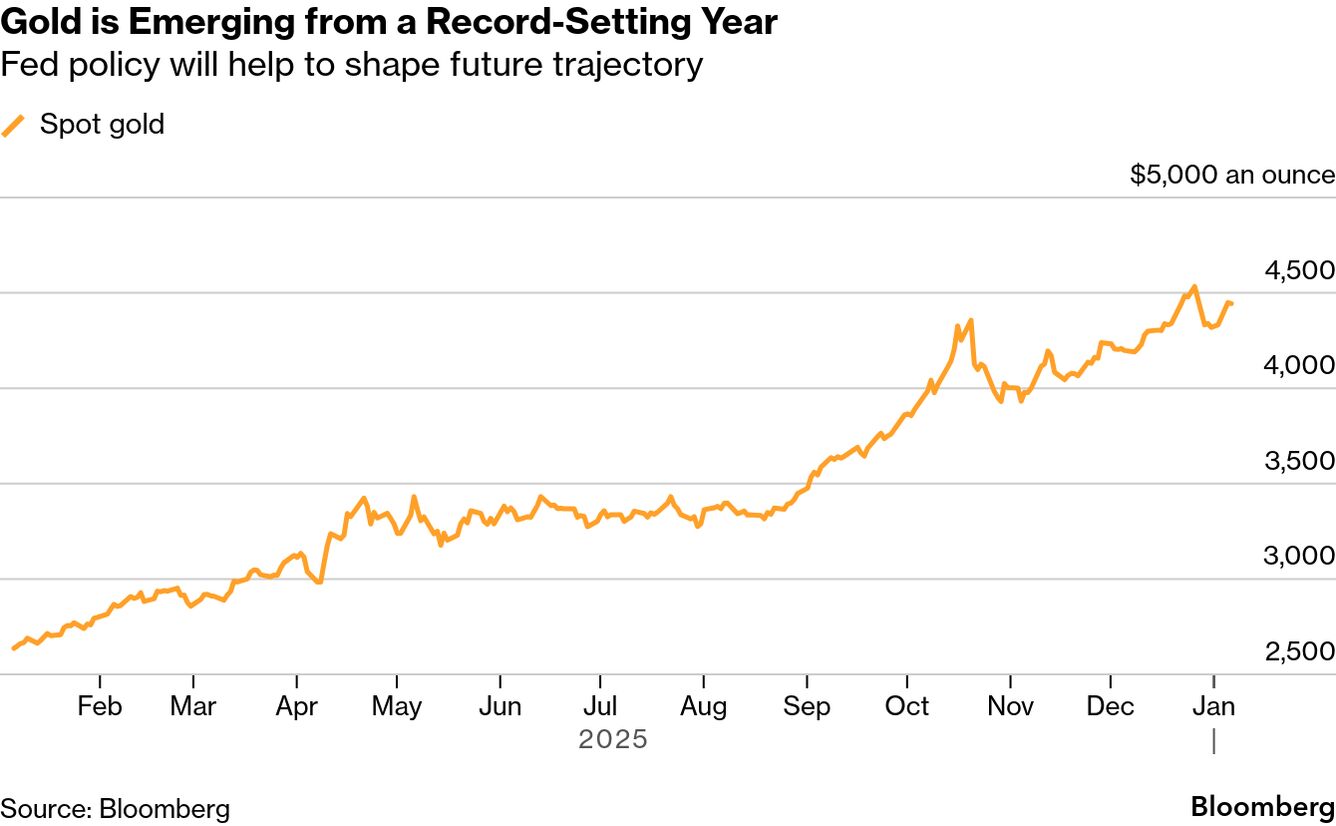 Bullion hit an all-time high of $4,549.92 on Dec. 26. Some leading banks forecast further gains this year, especially with the Fed expected to deliver additional rate reductions and Trump reshaping the US central bank’s leadership. Goldman Sachs Group Inc. said last month that its base case was for a rally to $4,900 an ounce, with risks to the upside.