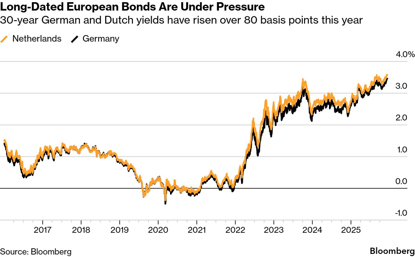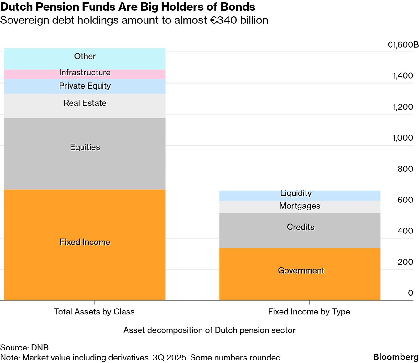 The €1.6 trillion Dutch pension system is shifting from bonds to riskier assets starting Jan. 1, potentially causing volatility in European bond markets. This could lead to higher long-term yields and a steeper yield curve, with market participants bracing for impact during low-liquidity holiday periods.
