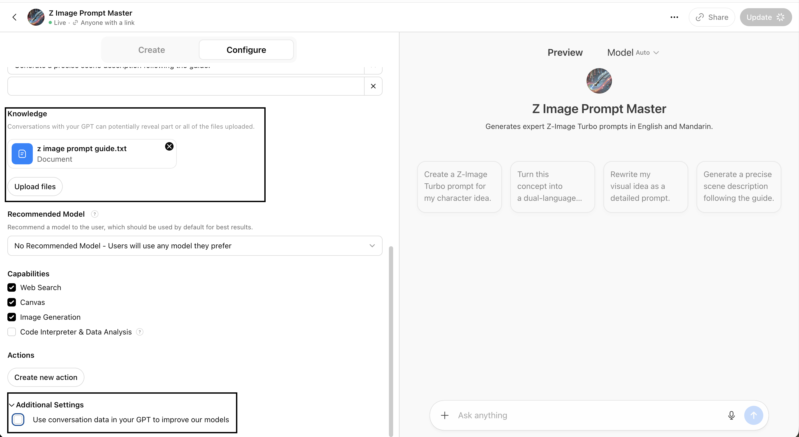 You’ll also want to make sure to uncheck the option to let OpenAI use your conversations with a GPT to improve its models. That is basically an open door for them to understand the instructions and everything you did to build the Agent, all the data you fed, and all the interactions and conversations you had with it. So it’s important to leave it off.