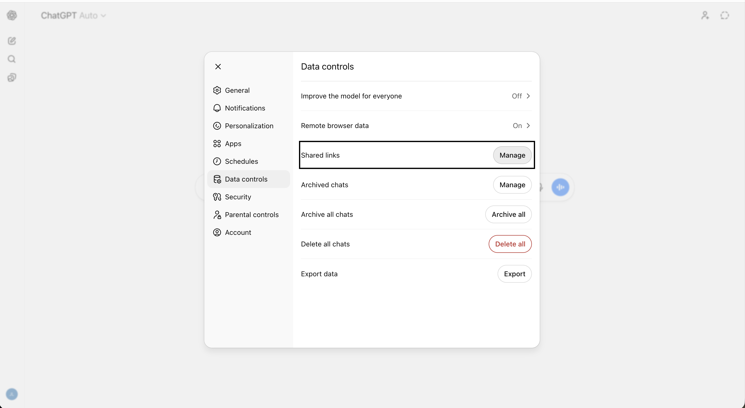 If you have archived anything, unarchive and delete it. Additionally, if you have shared any conversation links with other people, deleting the original conversation invalidates the link—but if someone already imported your chat into their own history, your deletion does not remove their copy.
