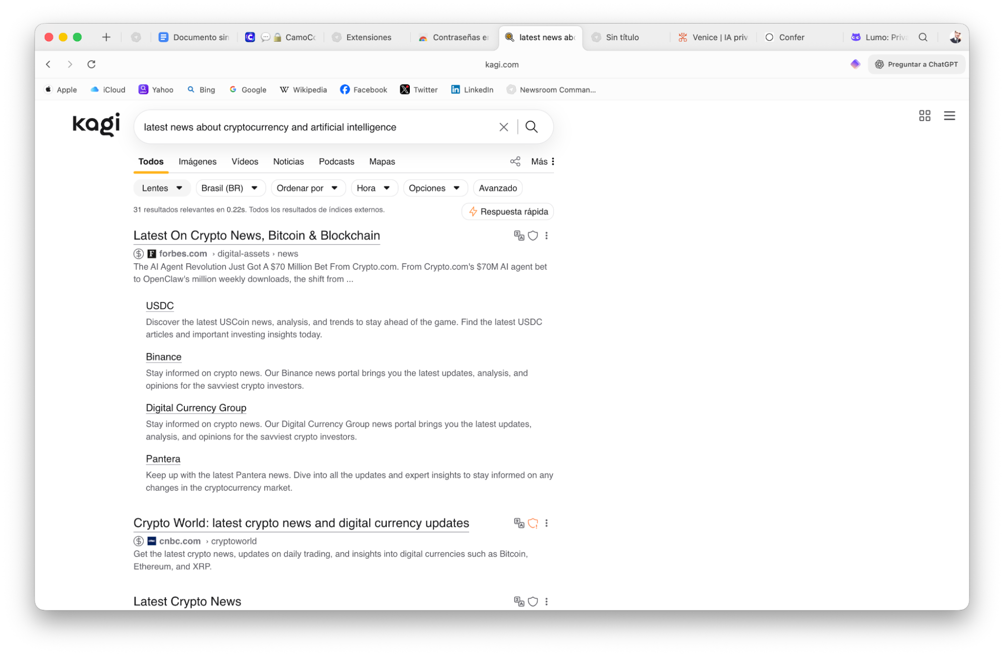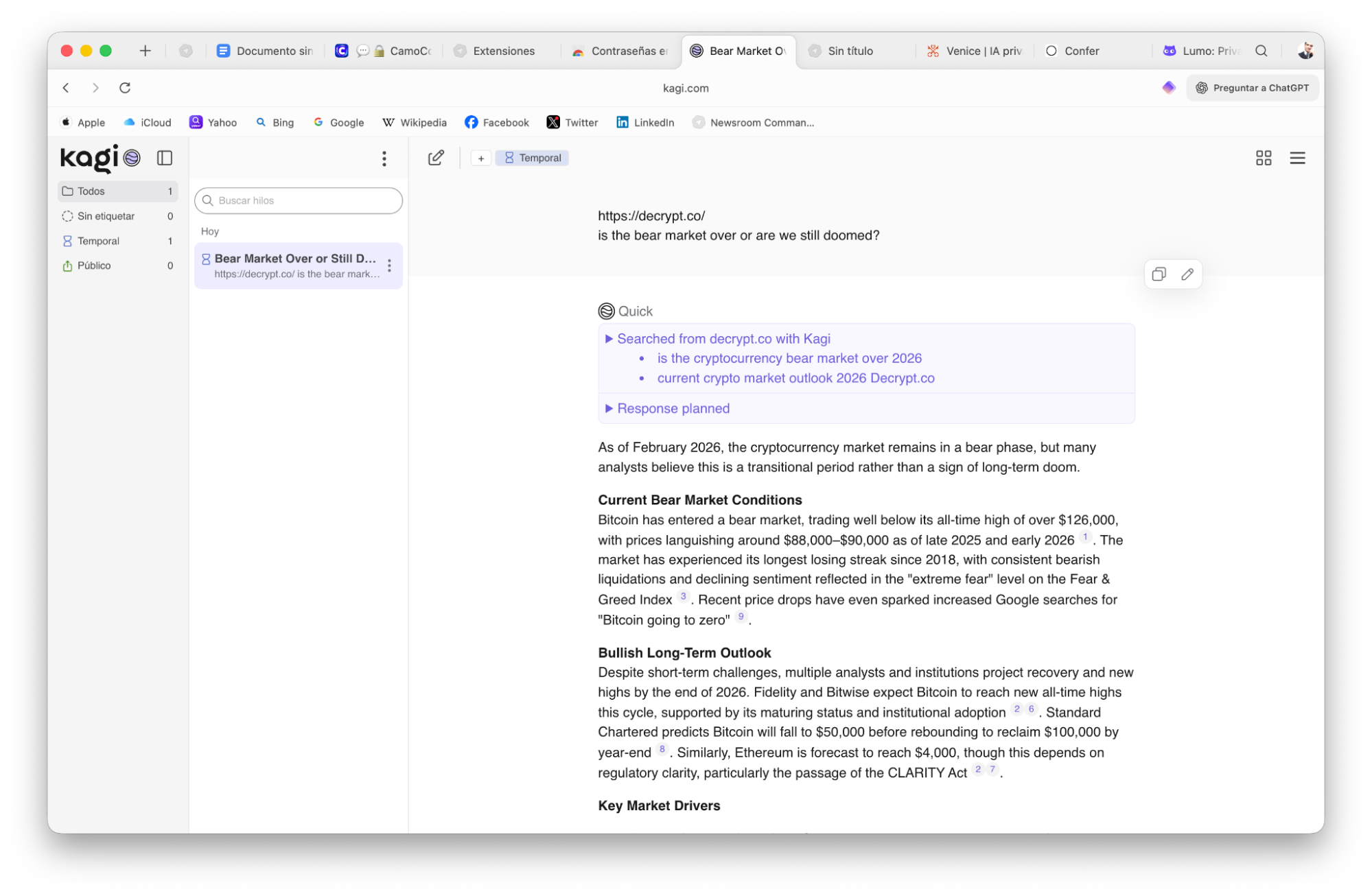 The Kagi Assistant feature is pretty clever. You pick a source and ask the assistant questions. The AI answers exclusively based on that site. We tested it and got a seven-URL briefing on the crypto bear market, all sourced from Decrypt, formatted like a Perplexity summary but scoped entirely to one domain.