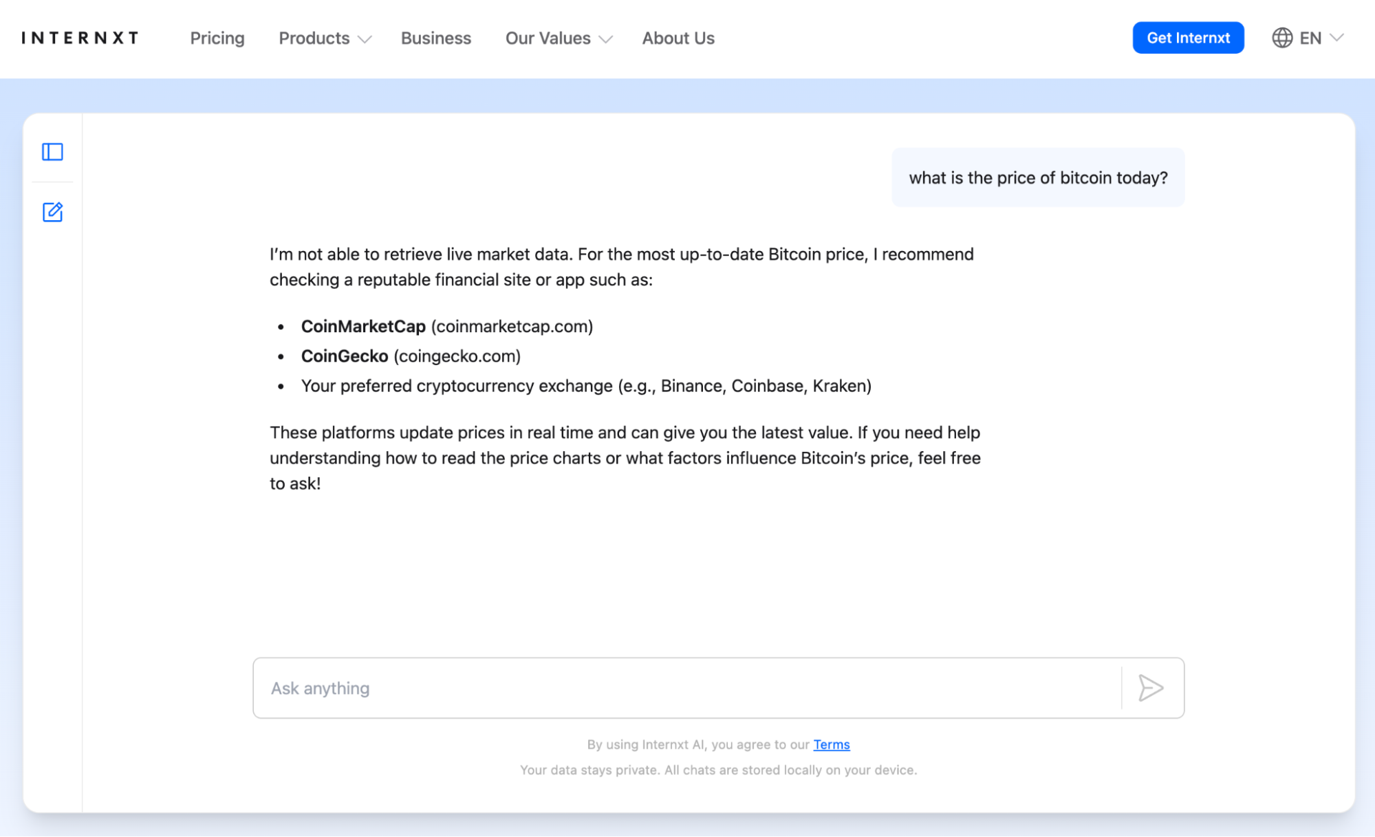 The catch is equally simple: It's way too basic. So basic it feels like a product built to simply catch some of the AI hype. No web search, no image generation, no model selection, no agents, no file uploads. It's a clean text box with a privacy-first AI behind it. That's it.