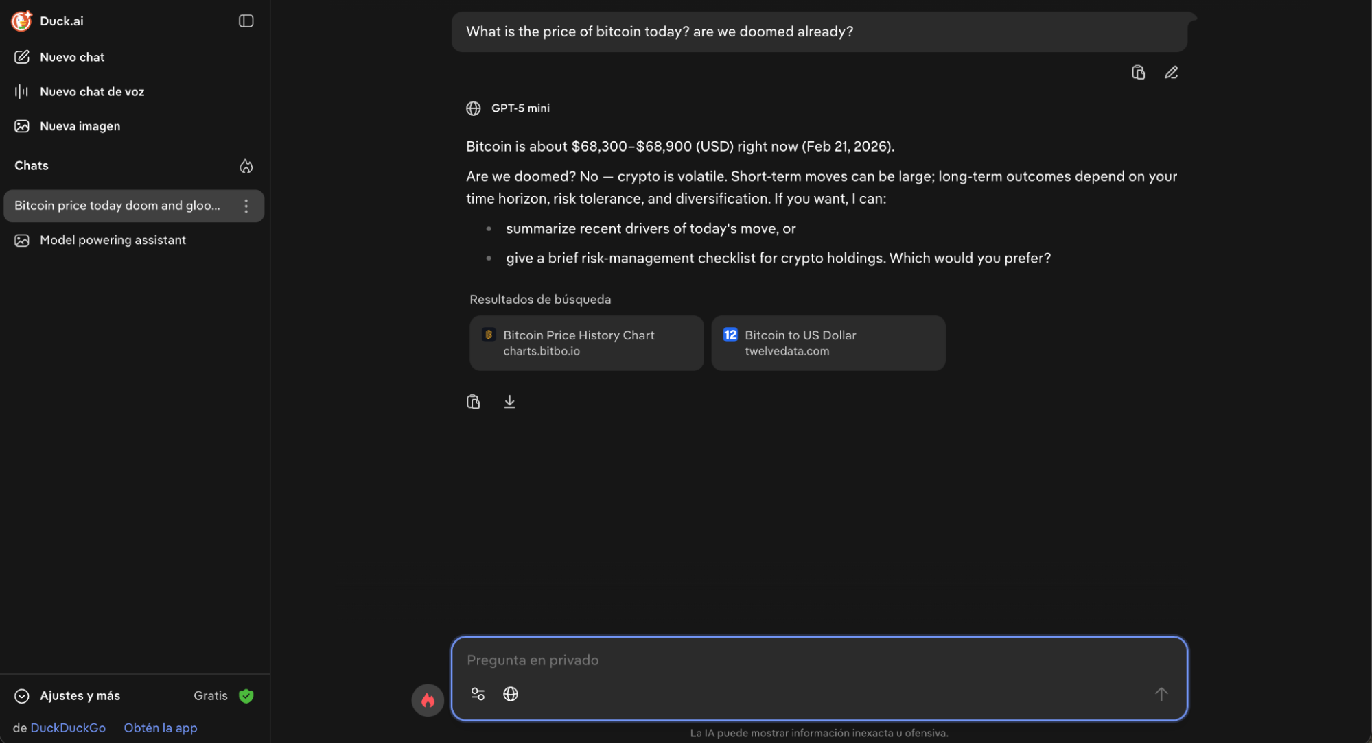 That said, for most people who want meaningfully better privacy than ChatGPT but aren't running a whistleblower operation, Duck.ai is a very easy on-ramp. No setup. No account. Free. And it works.