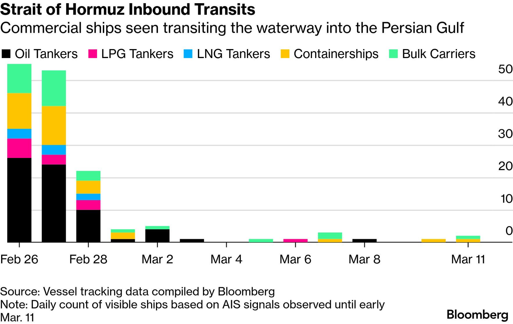 Note: Daily count of visible commercial ships based on AIS signals. Total transits in both directions observed until early Mar. 11
