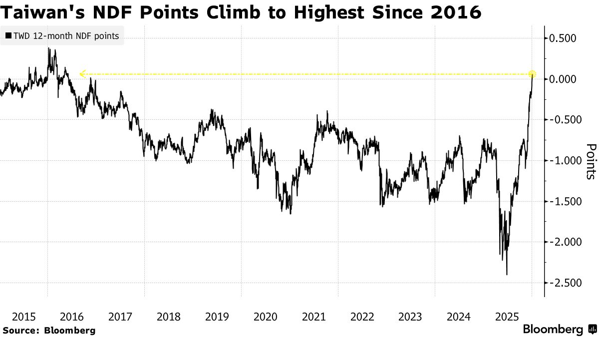 The US dollar’s 12-month non-deliverable forward points against its Taiwanese counterpart turned positive for the first time in over nine years this week, a sign that hedging costs have significantly eased. Previously, the gauge had fallen way below zero and hit the lowest level on record in June.