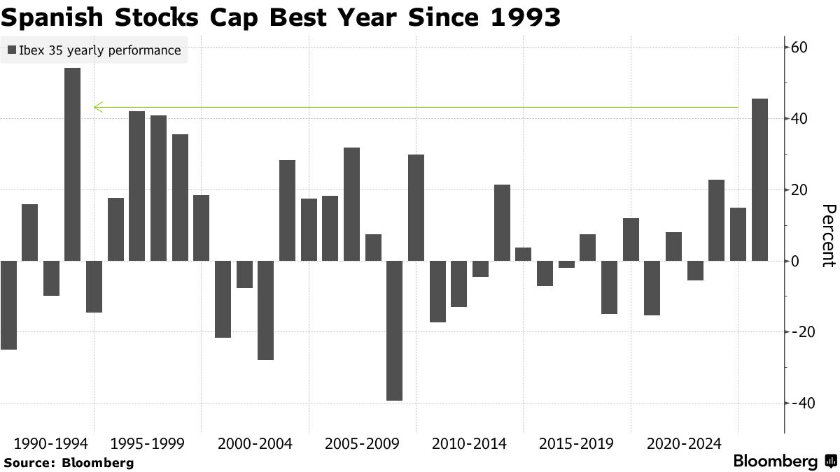Spanish stocks are set for their best year since 1993, driven by strong bank performance and a brightening earnings outlook. The Ibex 35 Index has gained 50%, with banks like Santander and BBVA leading the rally, while fundamentals remain favorable for continued growth.