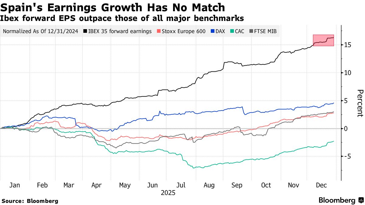 The country’s benchmark Ibex 35 Index had gained 50% this year through Tuesday’s close, which would be the most in 32 years and make it the best-performing major market in Europe. Estimates for Spanish companies’ earnings growth have risen more than 15% this year, outpacing European peers.