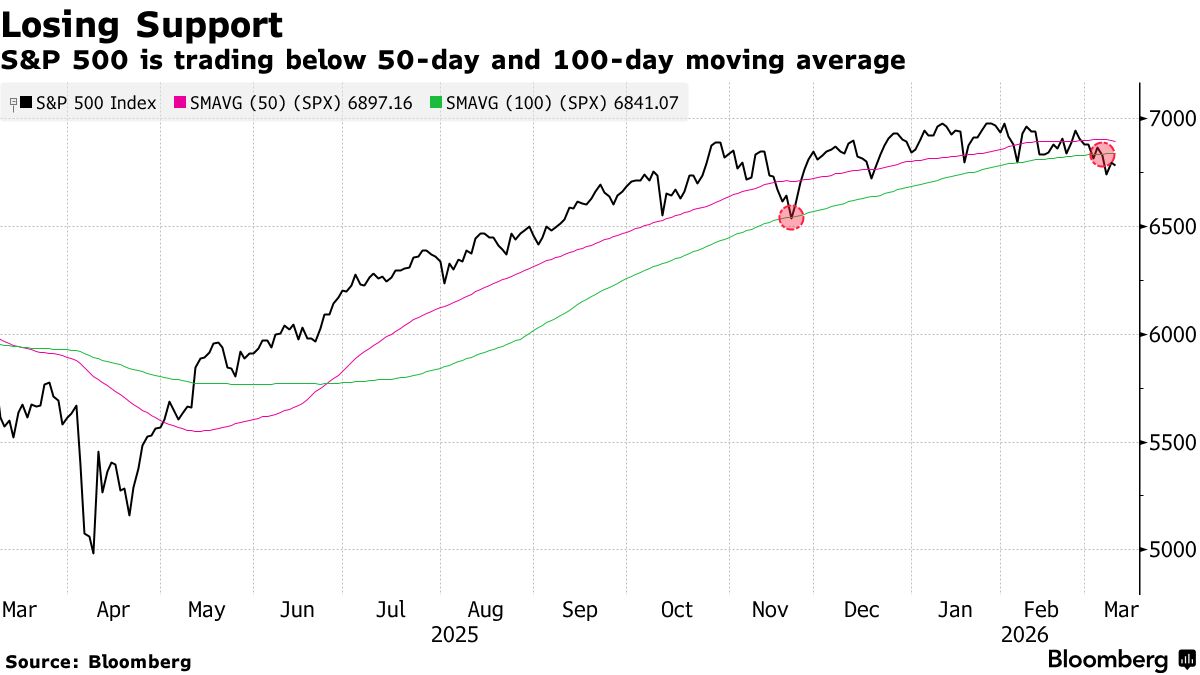 The S&P 500 Index was 0.05% higher at 10:16 a.m. in New York, while the Nasdaq 100 Index rose 0.4% and small-cap and blue-chip stocks fell. Brent crude rose 3.3% to $90.71 a barrel. The S&P 500 is still below both its 50- and 100-day moving averages, with Wall Street traders poring over charts to determine how much further the gauge could fall.