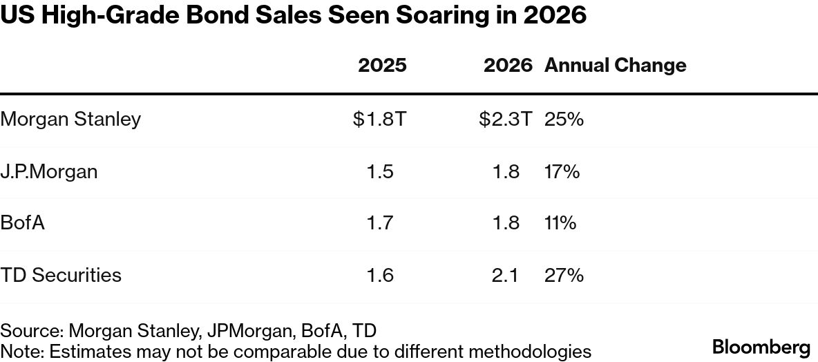 Morgan Stanley strategists predict more than $2 trillion in US investment-grade debt sales to hit the market next year, which would be the most ever. That’s expected to be driven by AI expansion projects, refinancing of looming maturities and acquisition financing.
