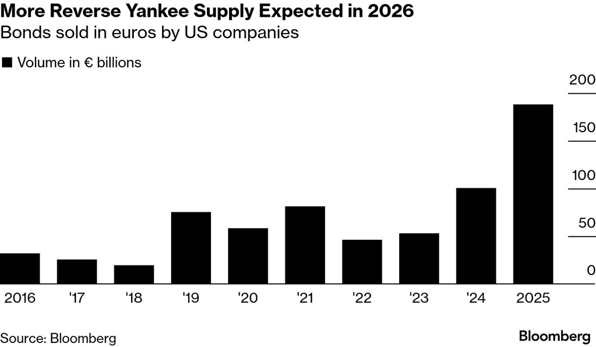 US companies selling euro-denominated bonds are also set to help drive record issuance in Europe. So-called reverse-Yankee supply climbed to a record €188.1 billion in 2025, including financial and non-financial debt, according to data compiled by Bloomberg. Most forecasters expect a further increase in 2026.