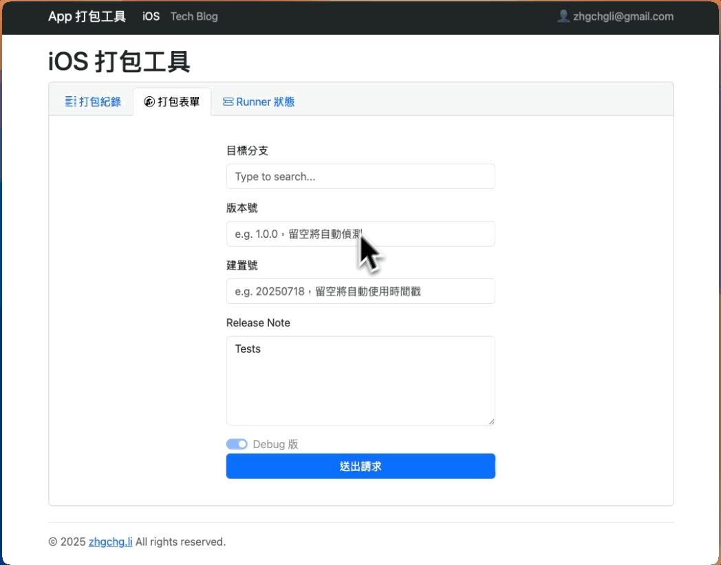 - •使用 GAS Web App 作為中繼站,整合 GitHub、Slack 等 API,提供友善的打包表單和進度追蹤。