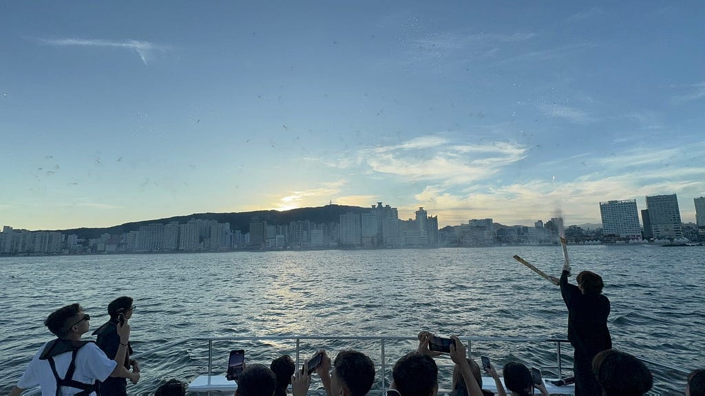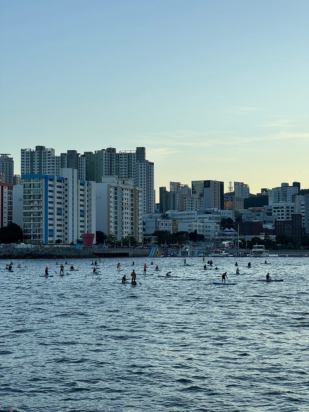 大約 20 分鐘後就會到達廣安里海灘前的海域,可以看到很多玩 SUP 的遊客;會在這停留跟放煙火;煙火就是這時段出航的各個遊艇的船家工作人員一起手持燃放,不過天還很亮所以看不太到。
