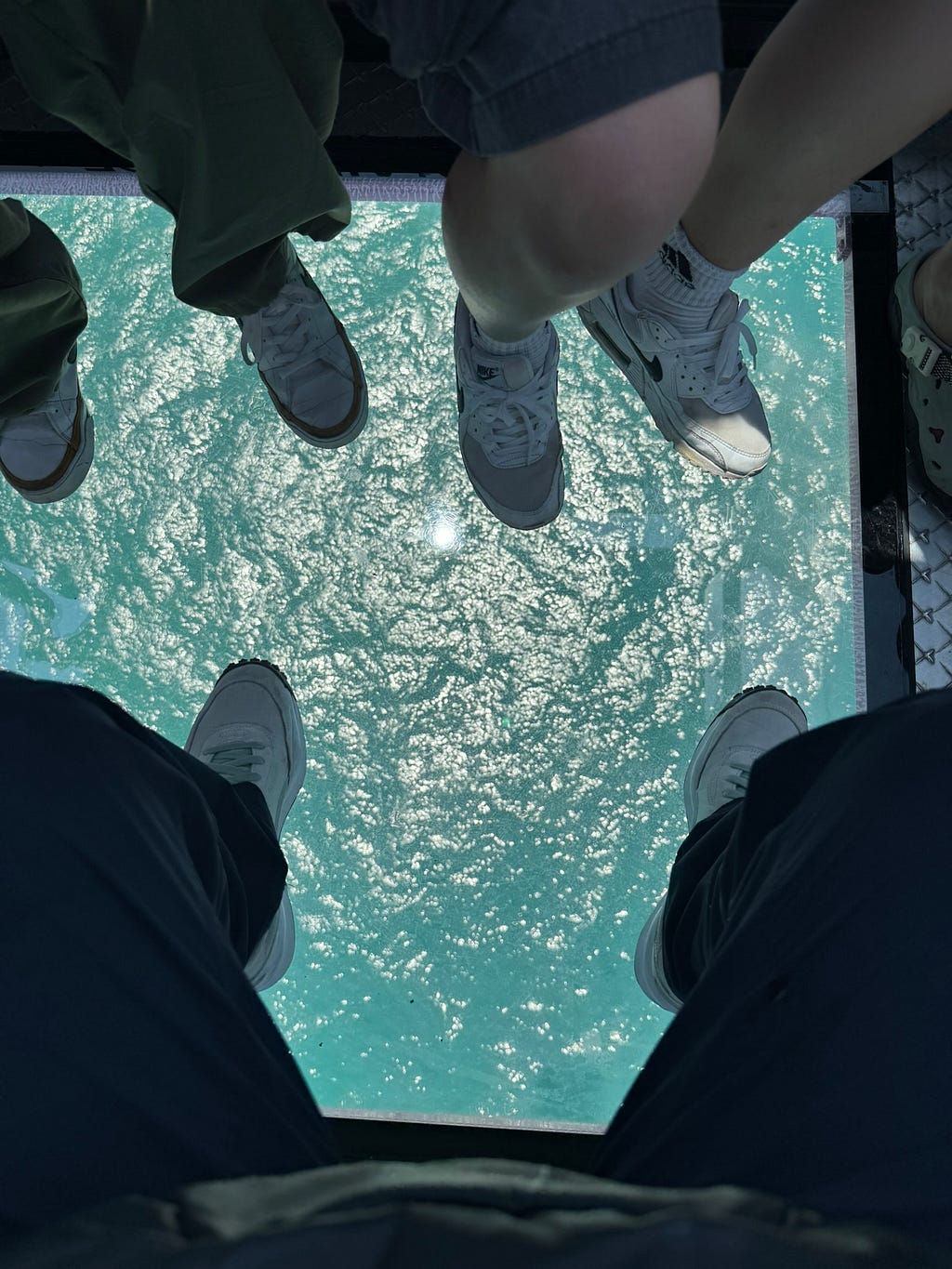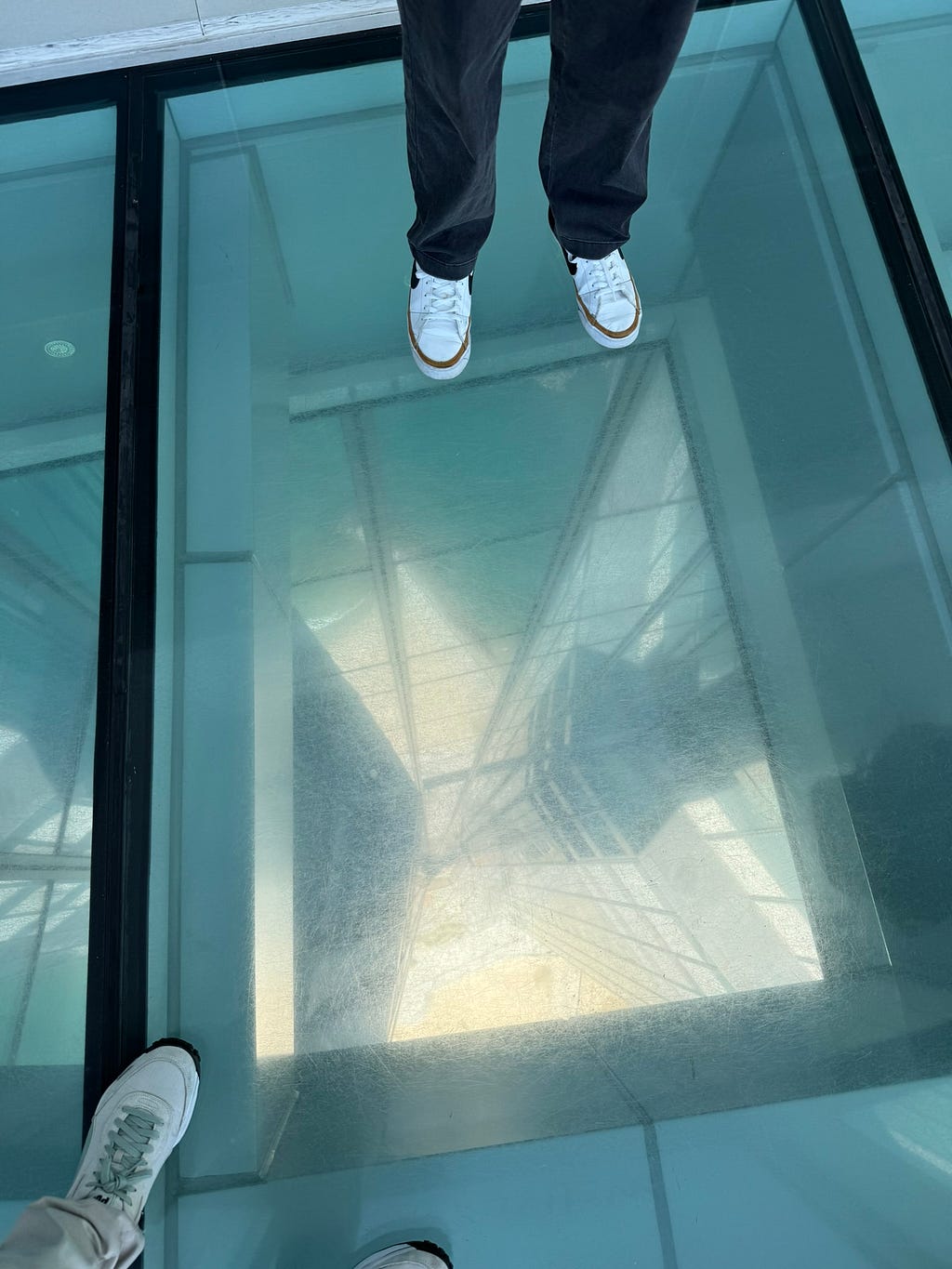 有一個透明玻璃地板橋,不過玻璃磨損嚴重效果普普;還有可以透明玻璃廁所。