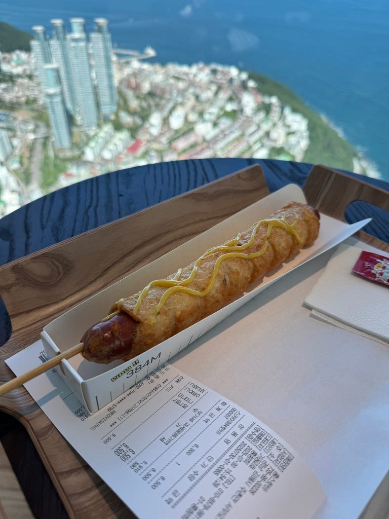 朝著海雲台方向(高樓)走出來到路口,對面右邊就是有名好吃的 鹽麵包 — Jayeondo saltbread (等下會回來買)左邊一路往下走到面海的入口就是 釜山 Sky 入場處。