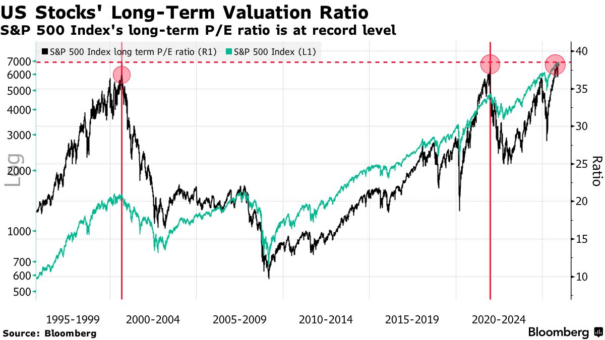 Buoyed by tech, the long-term valuation ratio of the S&P 500 is now at an all-time high. This metric has exceeded previous peaks that preceded major drawdowns, such as in the summer of 2000 before the dotcom crash, or in January 2022 when the market started to price a surge in interest rates.