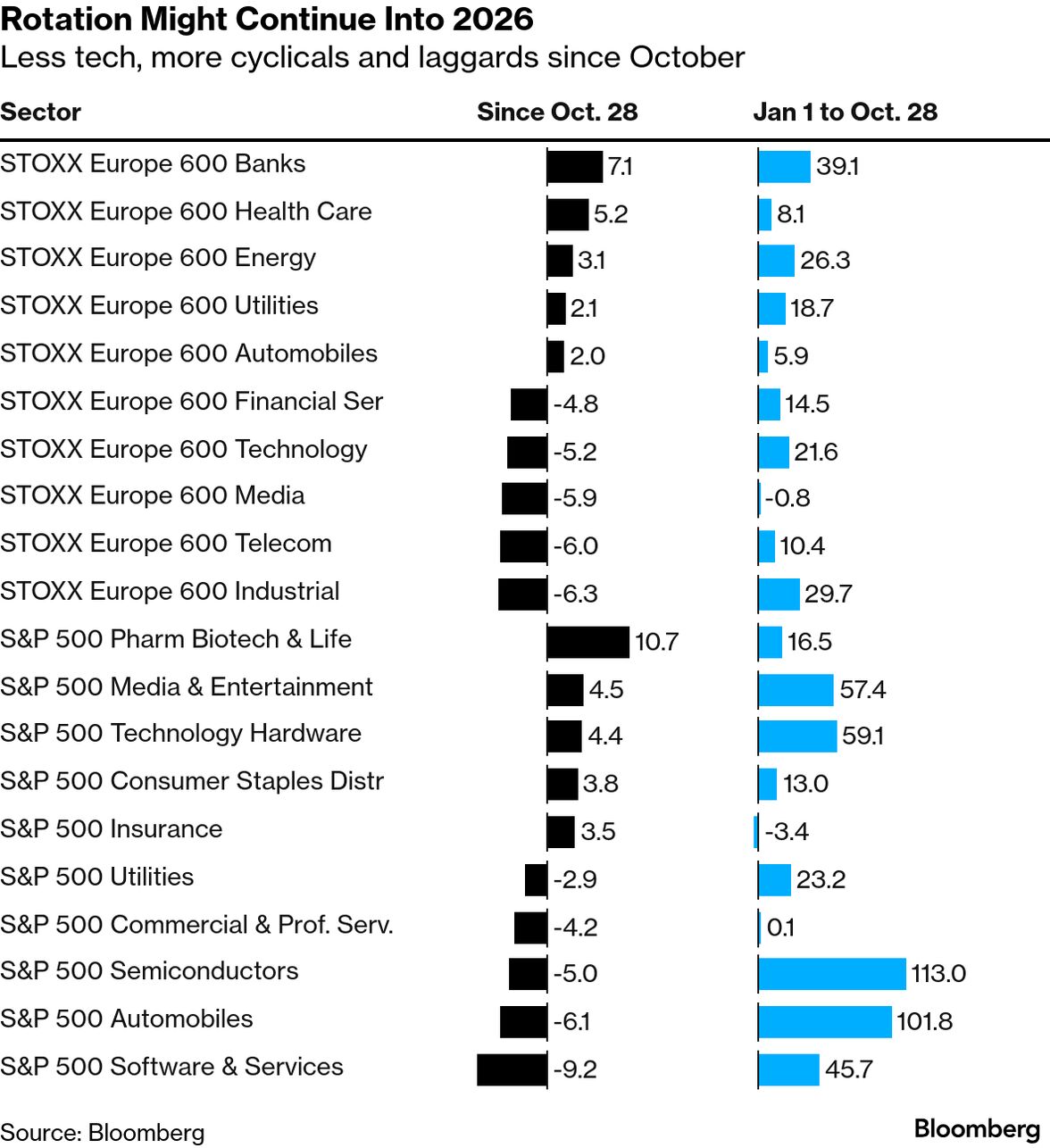 As AI keeps facing questions over returns and sustainability, chances are that investors might extend rotation in portfolio themes into next year. It’s likely that the next two or three earnings seasons might prompt further switching as investors gain insights into the health of various industries.