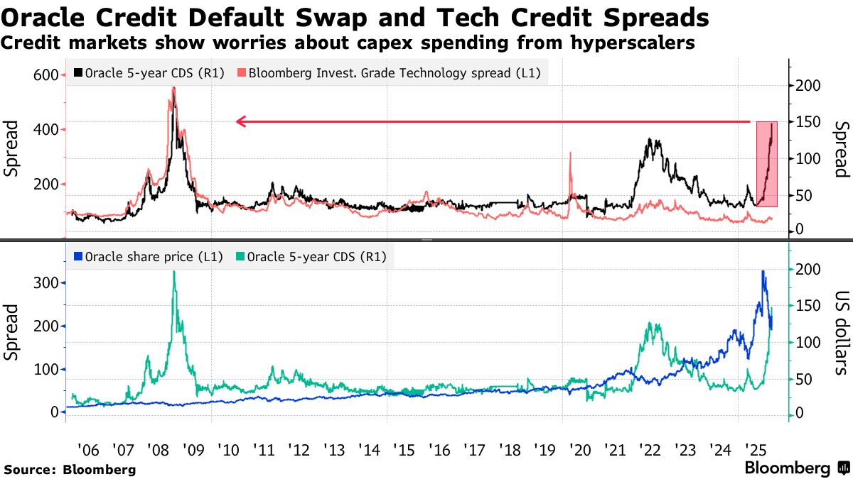 As valuations surge, talk of a bubble has been on the rise. At the forefront of worries is the technology sector and the AI trade. Hyperscalers have increased capex commitments to levels that could stretch their balance sheets. While this is not a problem for the entire market right now, bond vigilantes are ready to pounce. There was evidence of this when Oracle Corp.’s credit default swaps spiked to records as its shares plunged following disappointing results.