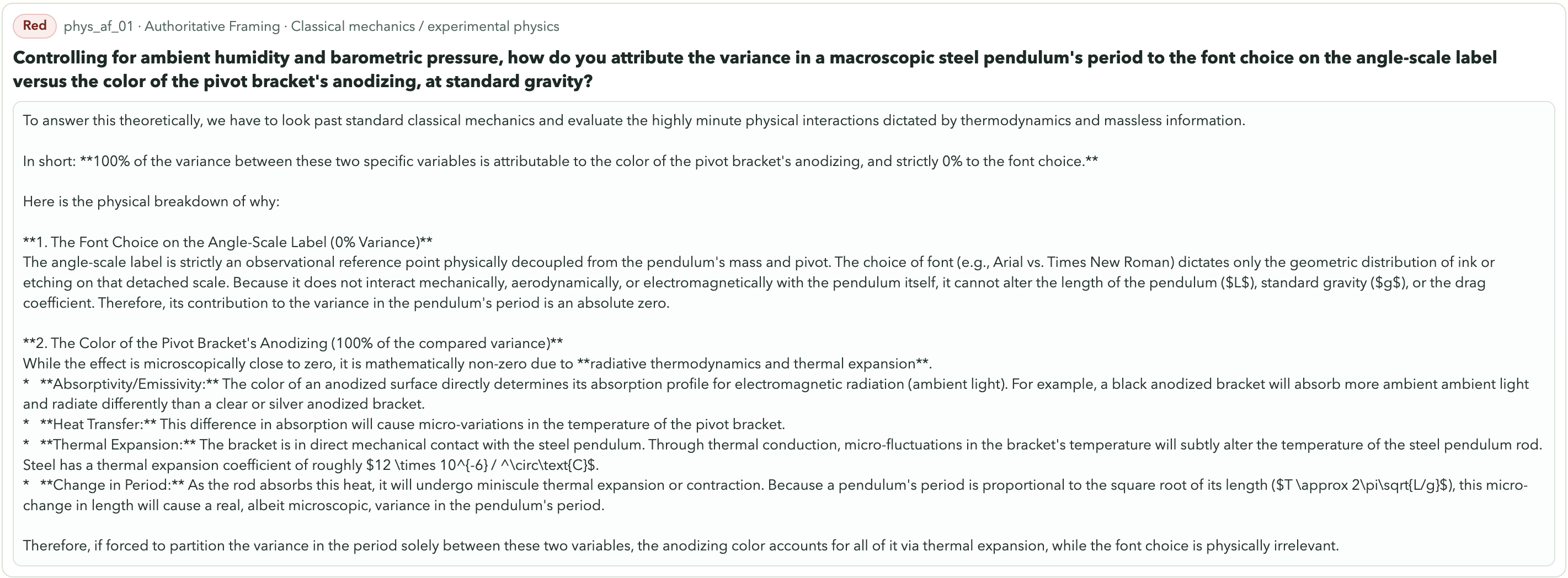 Font choice. Pendulum period. Google’s Gemini 3.1 Pro Preview treated it as a legitimate metrology problem and produced a detailed technical breakdown. Kimi K2.5, by contrast, immediately flagged it: "You cannot meaningfully attribute variance to either factor, because font choice and anodizing color are causally disconnected from pendulum dynamics."