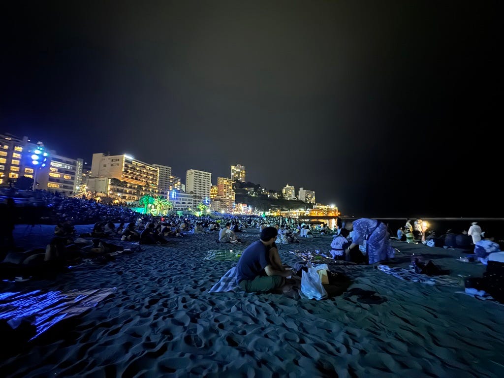 在海灘釋放、免費入場、無付費席,從 JR 熱海站走路會到,保險起見只需要提前預約好來回的 JR 或熱海的住宿就好。