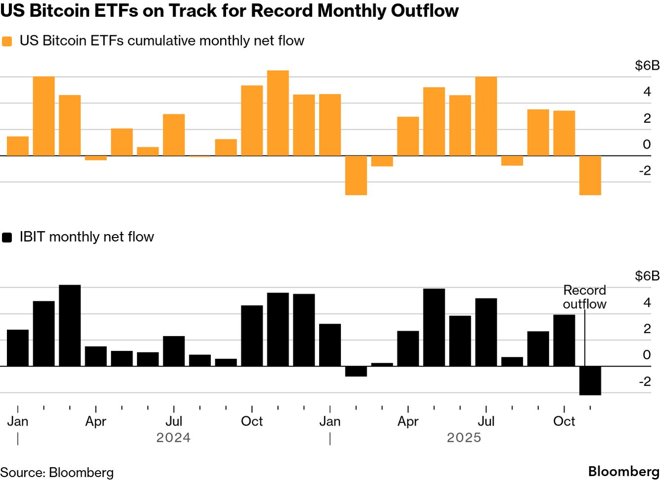 Investors have pulled $3.5 billion from the US-listed Bitcoin ETFs so far in November, almost equaling the previous monthly record for outflows of $3.6 billion set in February, according to data compiled by Bloomberg. BlackRock Inc.’s Bitcoin fund IBIT, which accounts for about 60% of the cohort’s assets, has registered $2.2 billion in redemptions in November, meaning it will slump to its worst month barring a sharp reversal.