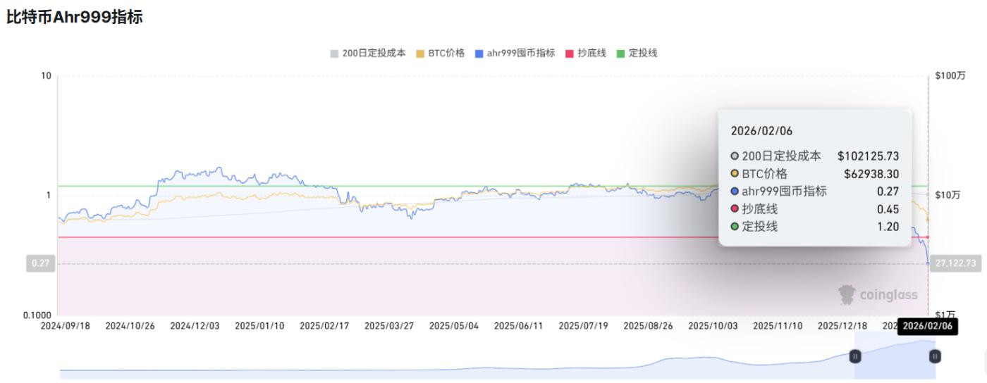 PANews reported on February 6th that Coinglass data shows the Bitcoin Ahr999 indicator has dropped to 0.27, significantly below the "buy the dips" level (0.45). The index last fell to this level on June 18th and November 22nd, 2022, and March 16th, 2020, respectively, coinciding with the "ETH crash and liquidation," the "FTX collapse," and the "316 crash."