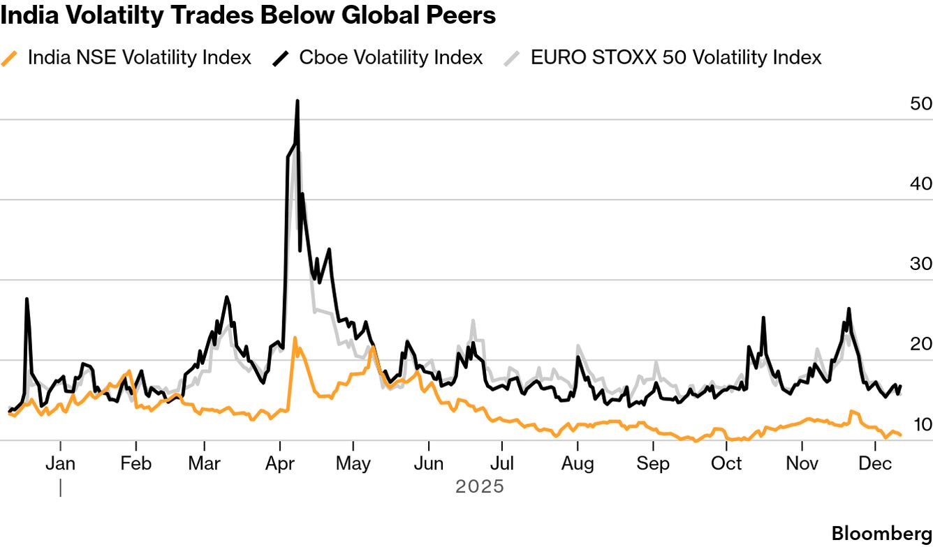 Indian markets have faced geopolitical tensions and a stalled trade deal this year, yet the country’s fear gauge has barely moved. The India NSE Volatility Index has decoupled from global trends and sits near 10, giving up most of its risk premium over the past six months. Some traders expect volatility to pick up in 2026, especially around the federal budget on Feb. 1. The message from the options market is clear: equity volatility opportunities have dried up. For options sellers seeking yield, the focus may shift to commodity options, where structurally higher volatility offers richer potential.