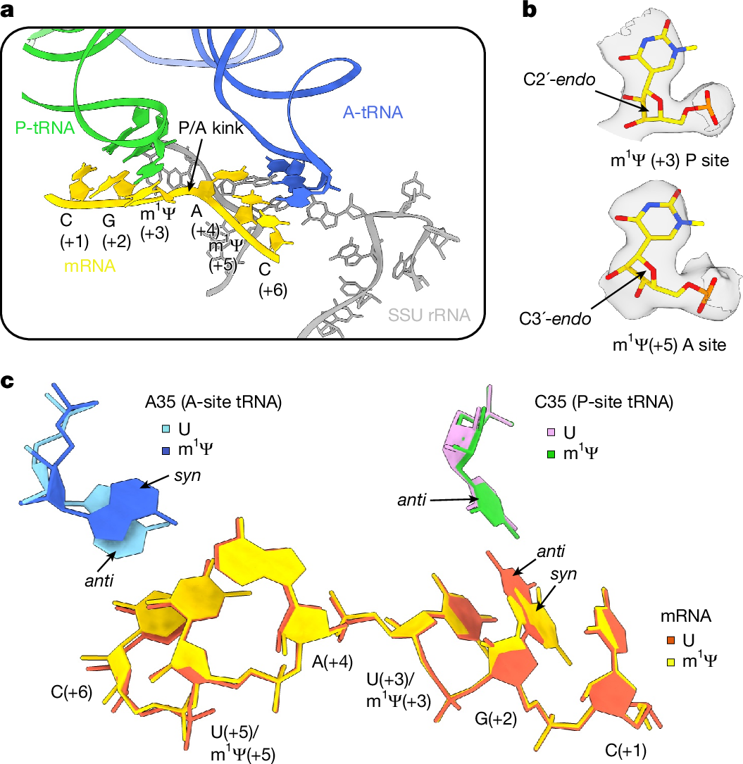 N1-methylpseudouridine (m1Ψ) in synthetic mRNA vaccines enhances protein production by slowing ribosome elongation in specific codon contexts while promoting translation initiation. Structural studies reveal m1Ψ alters ribosomal decoding center interactions, with strongest effects in mRNAs containing non-optimal codons with uridines at wobble positions.
