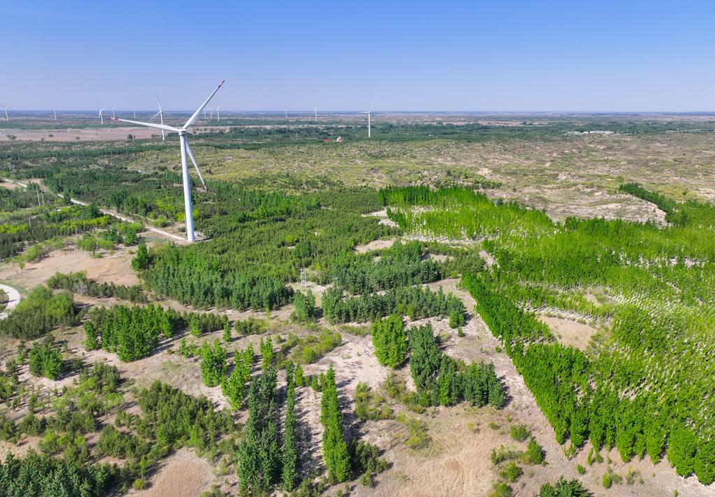 这是在内蒙古通辽市科尔沁沙地“双百万亩”综合治理工程努古斯台项目区拍摄的风力发电机组(2024年5月15日摄,无人机照片)。新华社记者 连振 摄
