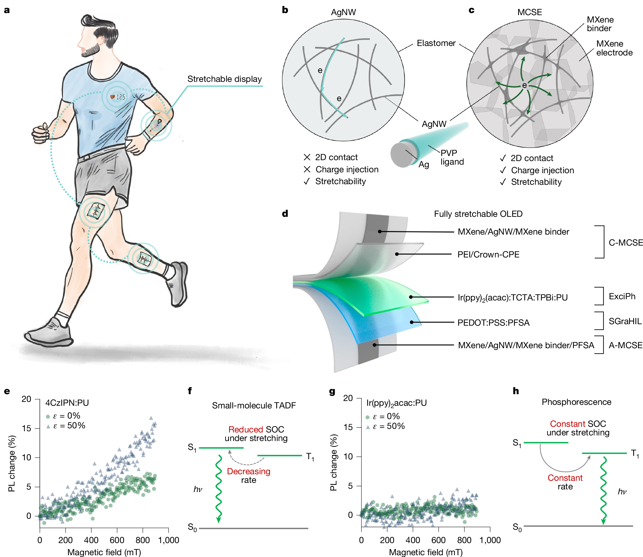 Researchers developed fully stretchable OLEDs with record efficiency using an exciplex-assisted phosphorescent layer and MXene-contact electrodes, achieving 17.0% EQE and minimal luminescence loss under strain.