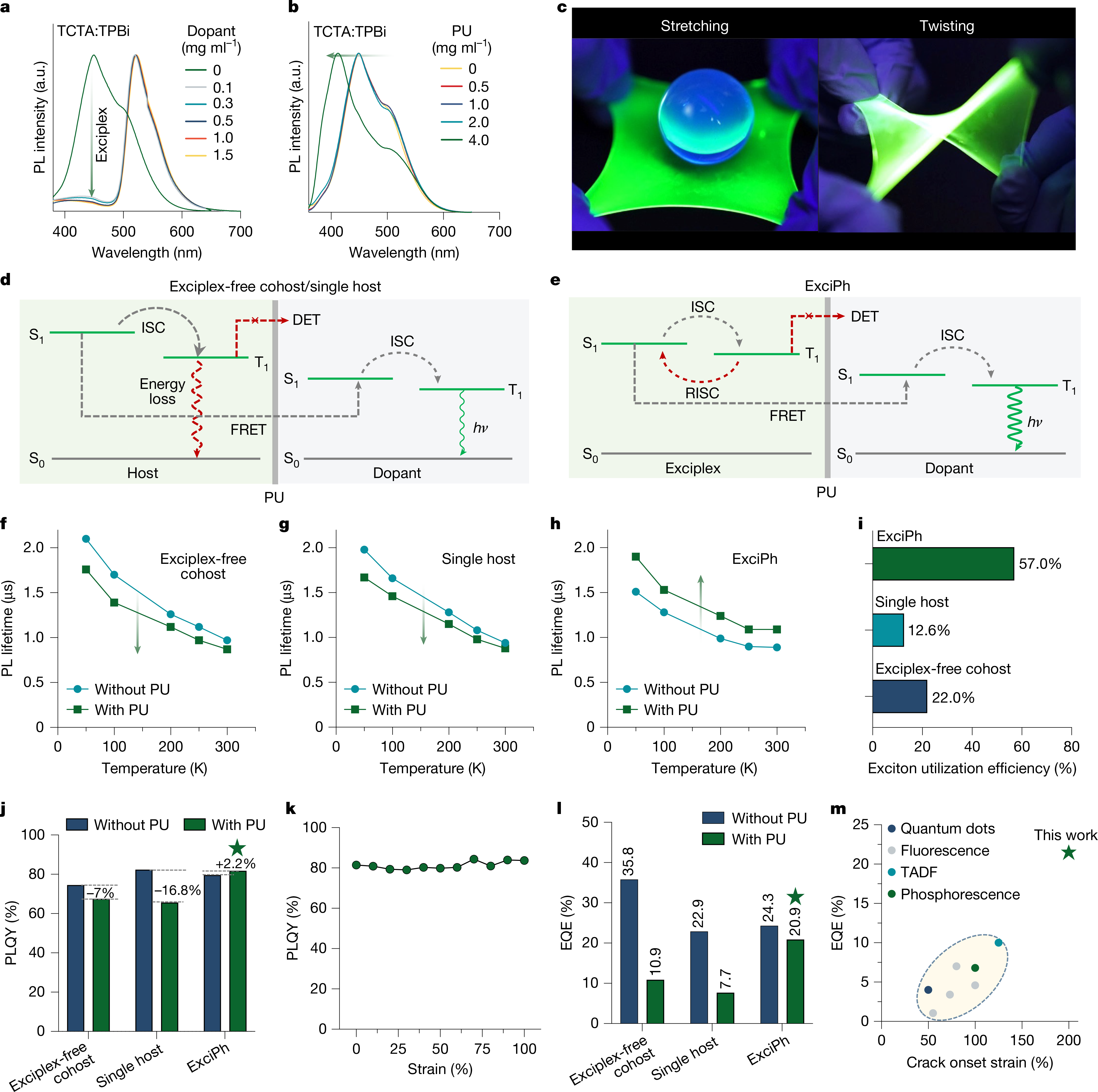 - •Incorporated an intrinsically stretchable exciplex-assisted phosphorescent layer to achieve over 200% stretchability and 21.7% EQE.