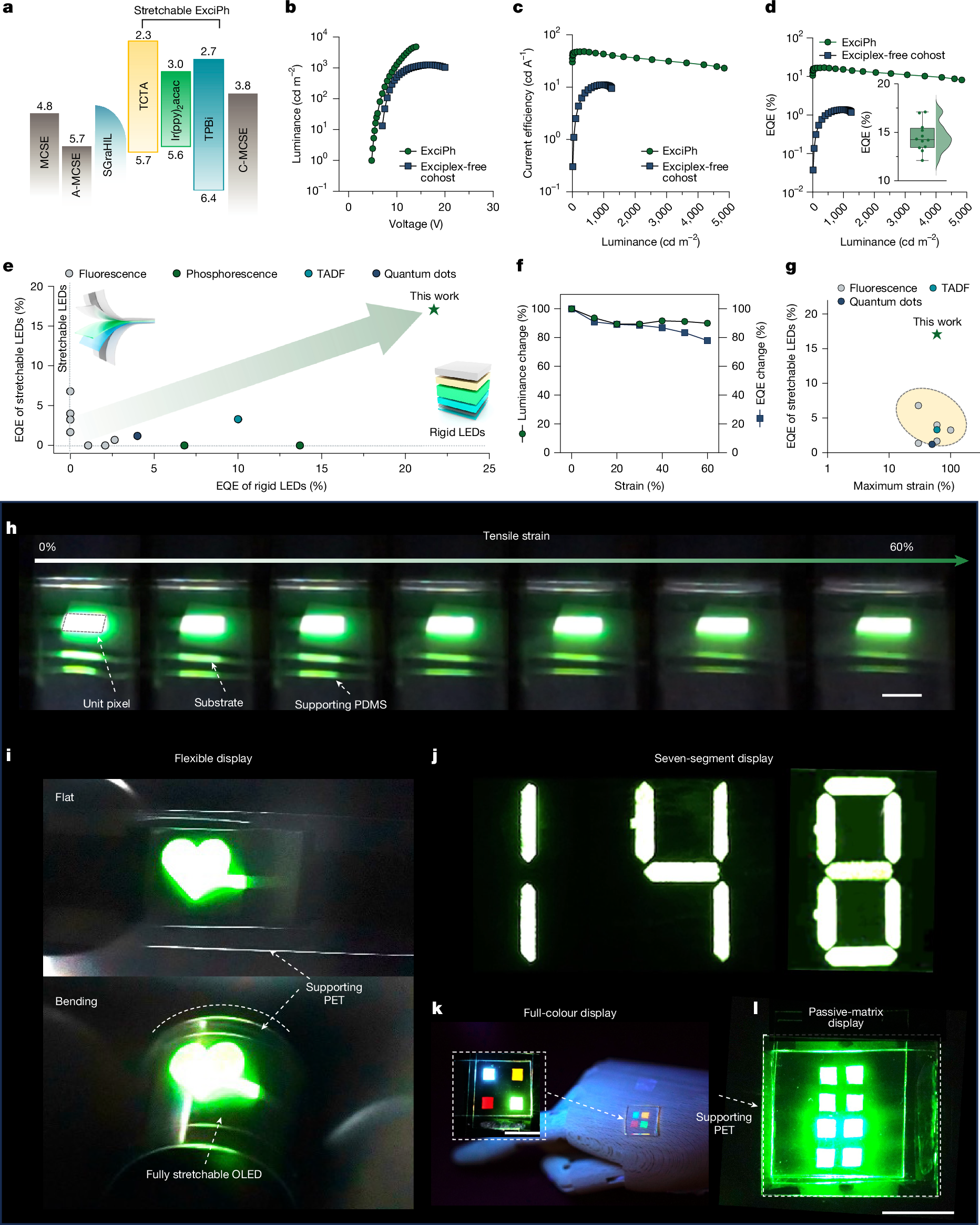 Exciplex-enabled high-efficiency, fully stretchable OLEDs