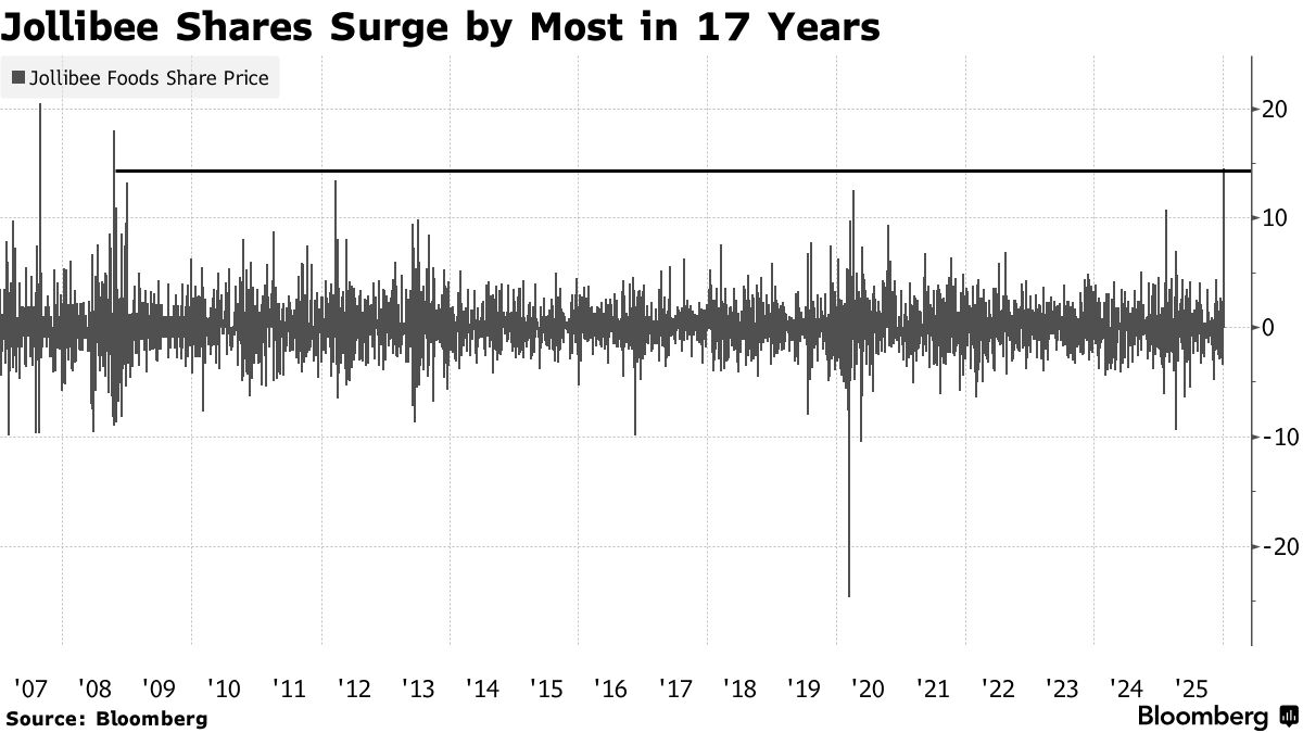 - •Jollibee's announcement of spinning off its international unit for a US listing led to a 14.5% stock surge, the largest since 2008.